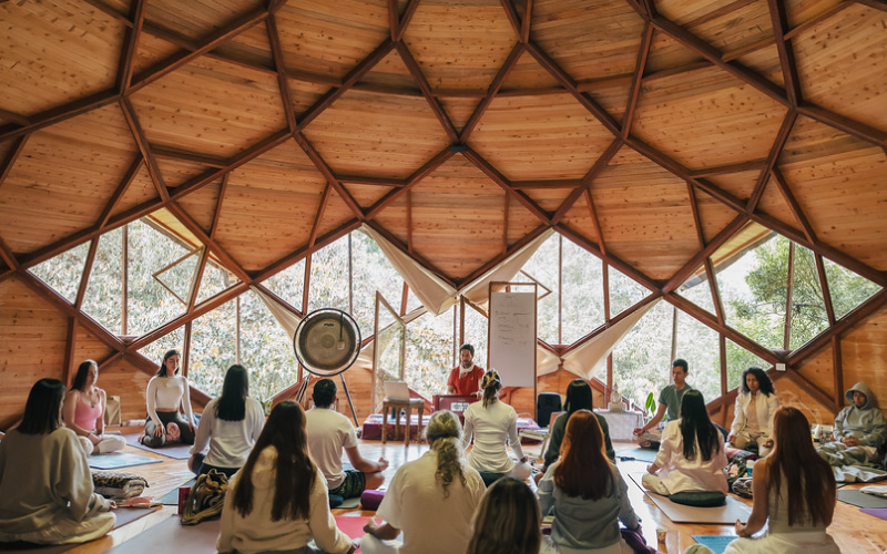 Bajo la geometría sagrada de nuestro Zome de madera, cultivamos un entorno vibracional único para la introspección y el silencio.